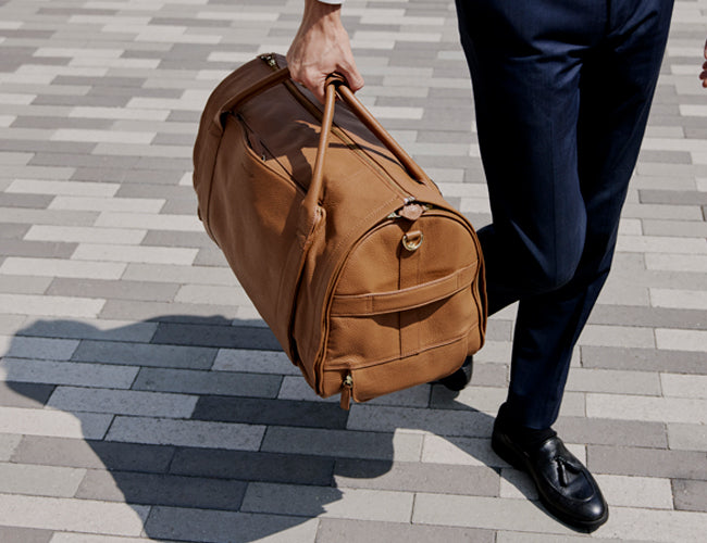 Full-grain leather. Hidden wheels. Converts to a 48" garment bag. Never check a bag — or compromise on looking the part.