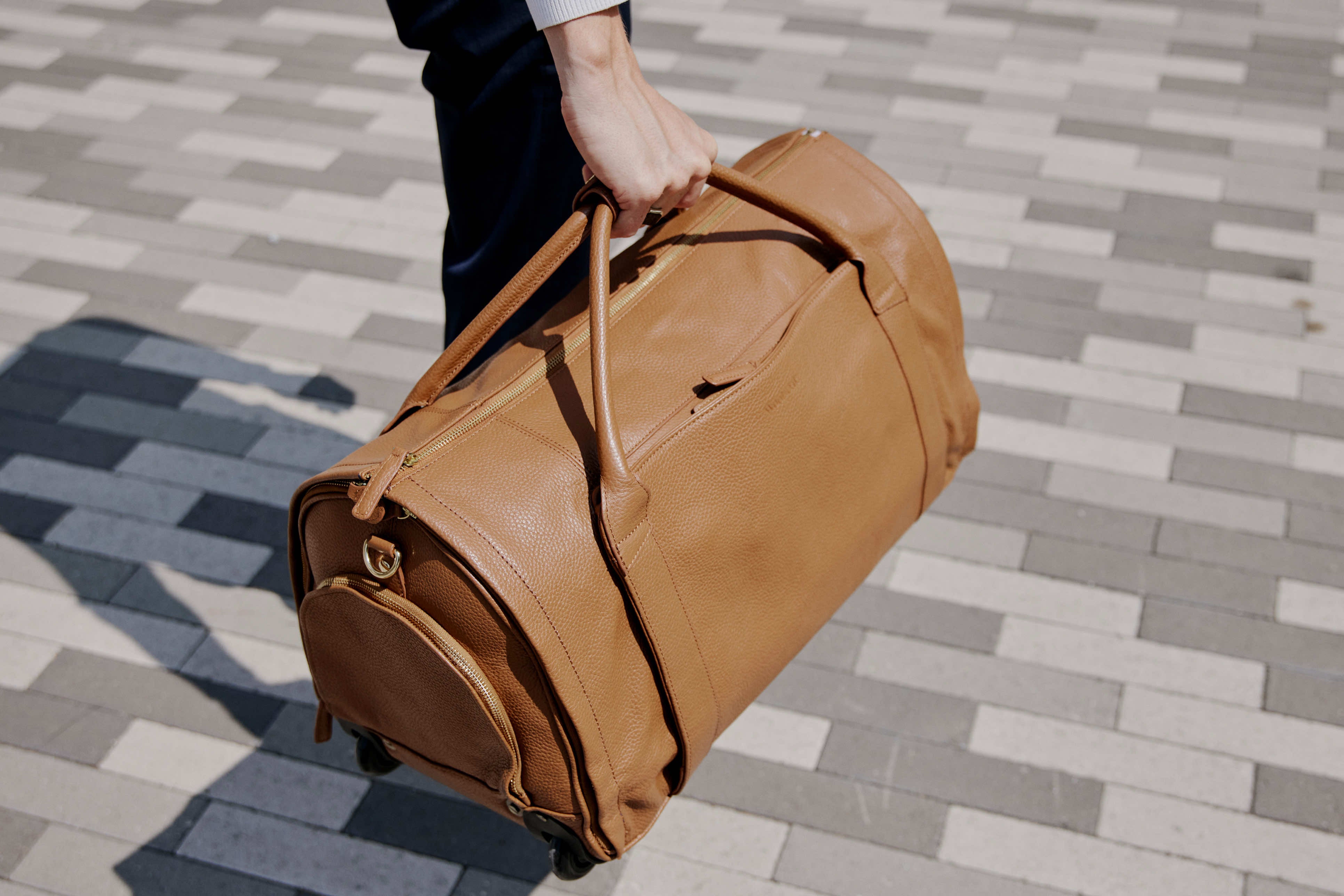 Turn heavy hauls into joyful rolls with our wheeled leather duffle – conquering cities, airports, and suitcase struggles with a wink of convenience and a dash of style!